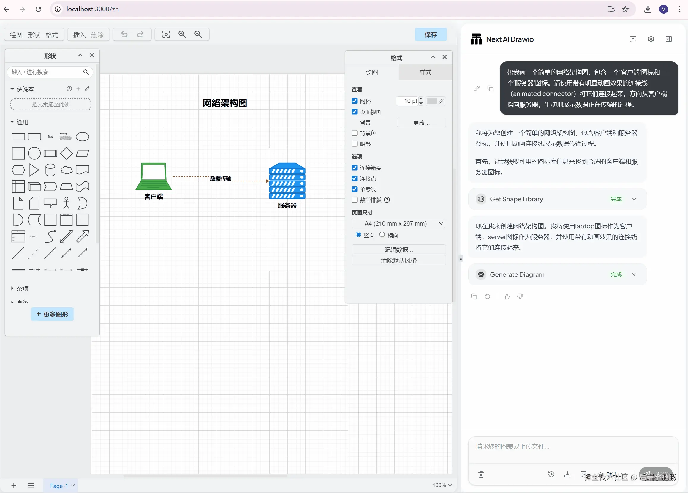 等待next-ai-draw-io安装,成功后打开网址http://localhost:3000/zh即可进入next-ai-draw-io操作界面,我们可以开始进行一句话生成流程图的操作了: