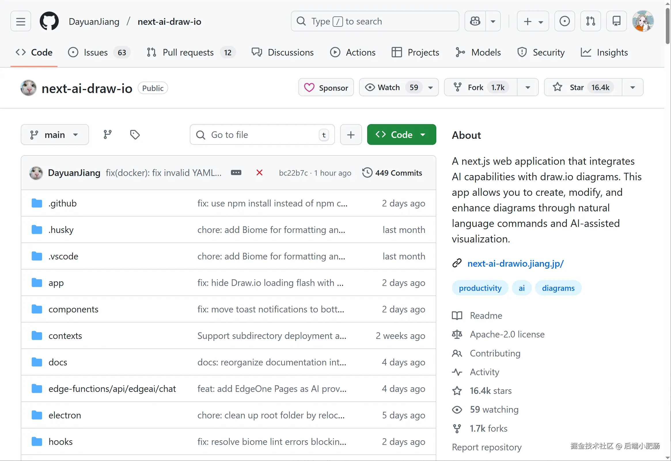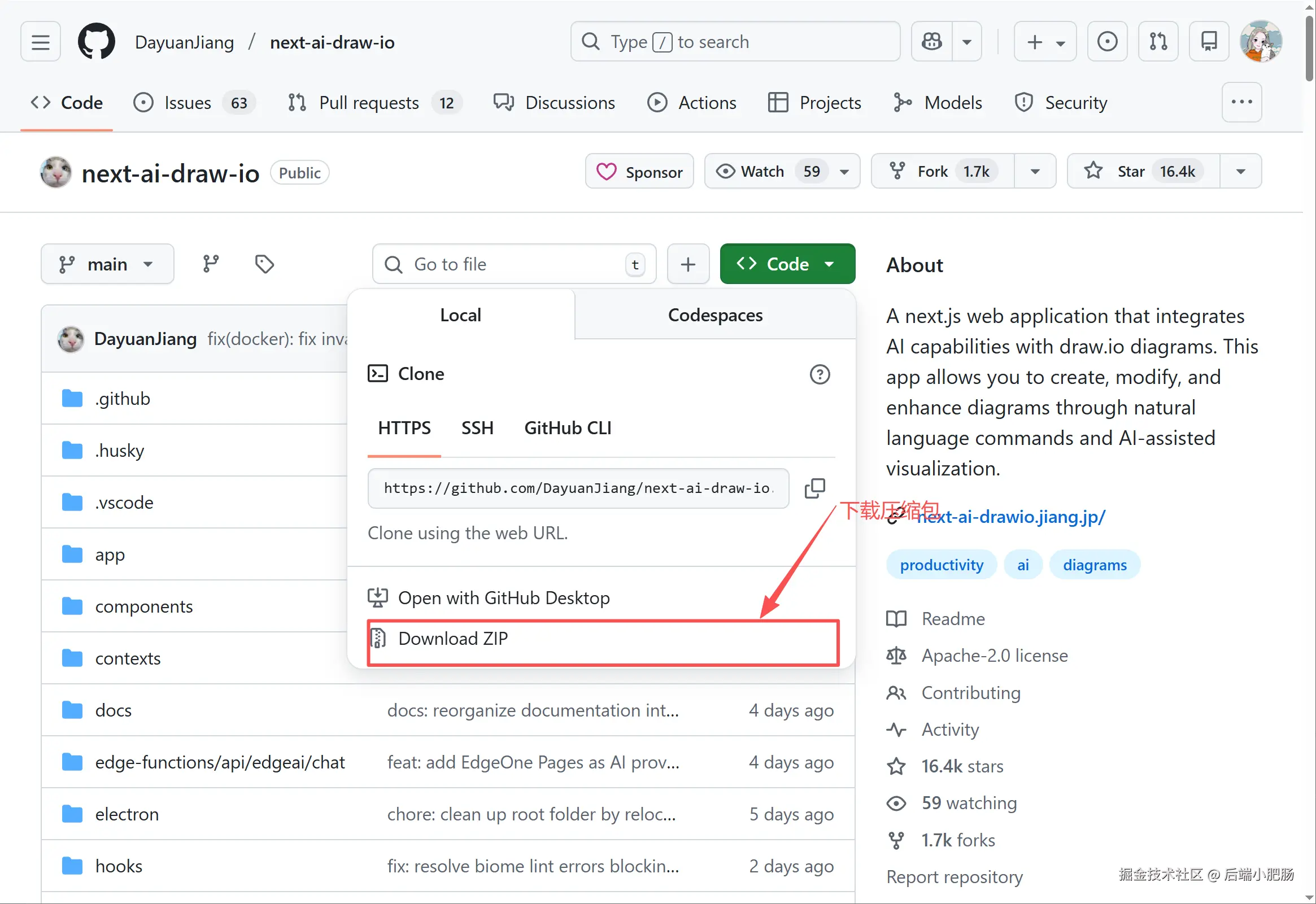 来到next-ai-draw-io仓库页面github.com/DayuanJiang... 点击下载压缩包按钮。