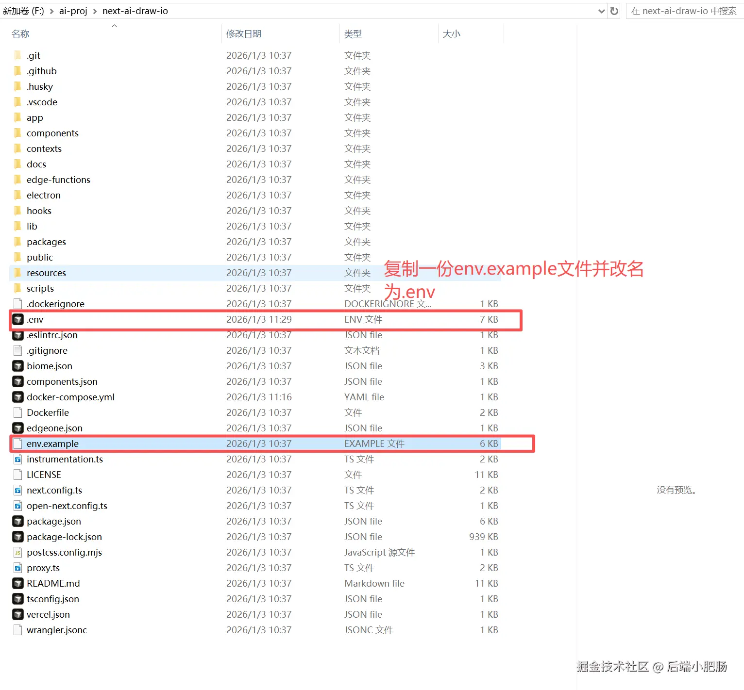 复制一份env.example文件并改名为.env。