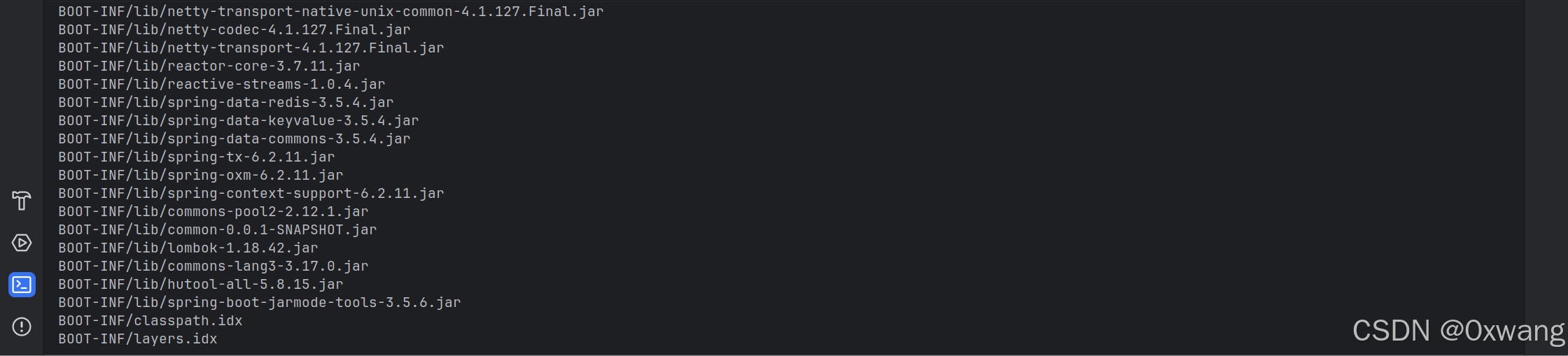 无runtime的war和jar包都能正常打包和运行,这一点就是打包规则的问题了,观察jar包结构:jar tf target/service-0.0.1-SNAPSHOT.jar