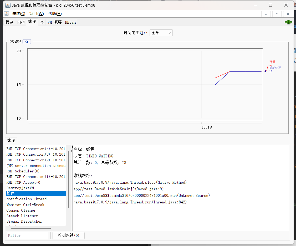 针对之后的 Java 进程,我们可以借助第三方工具来查看线程的详细情况。找到你之前下载好的 JDK17 的 jdx 17\bin\jconsole,该 jconsole.exe 就是这个工具。在进行连接的时候会提示我们不安全的连接,不用管它直接连接就行了。然后选择到 Demo1 来查看。如果看不到进程列表,那就右键点管理员方式执行即可。