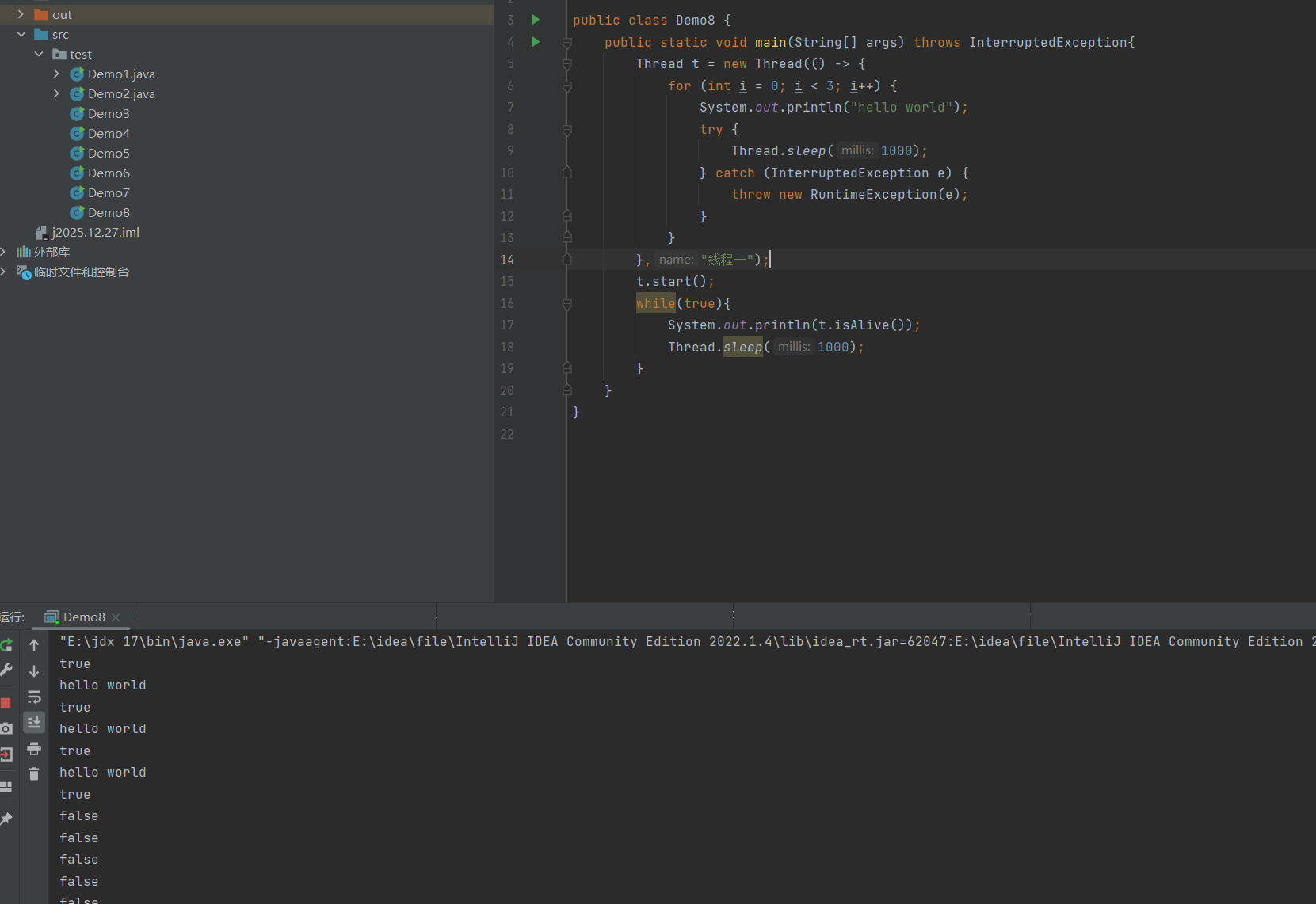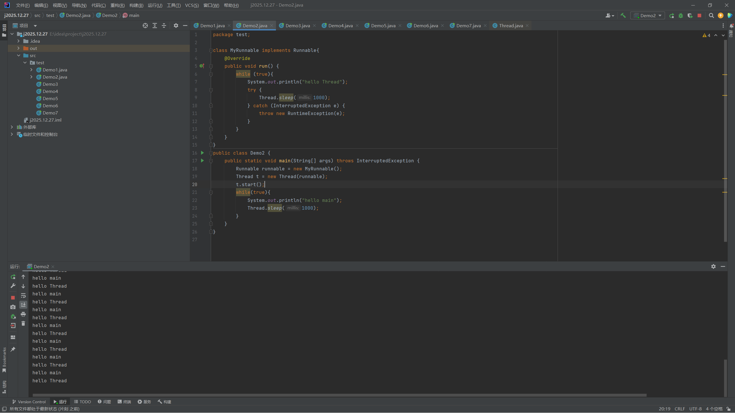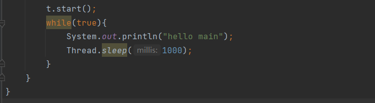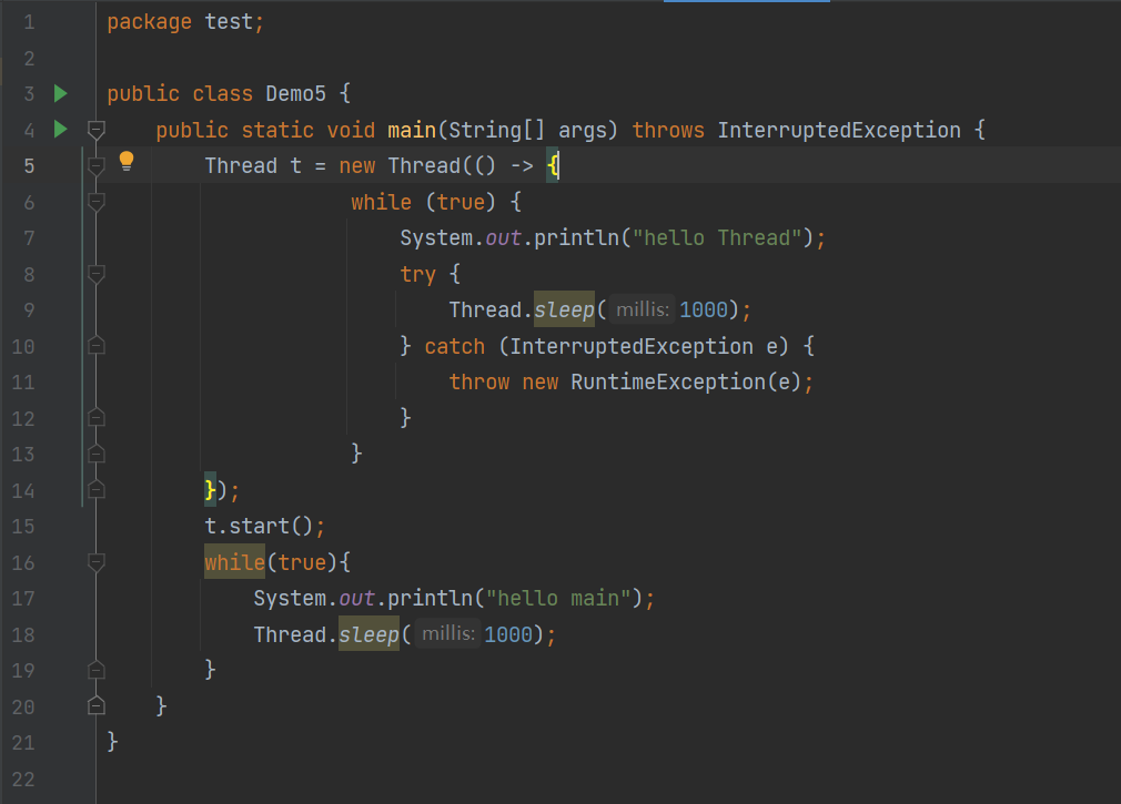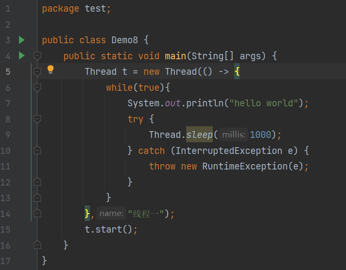 我们先在 IDEA 中新建出 Java 类,叫做 Demo1,在该 Demo1 中分别写两个死循环打印出 " hello Thread " 和 " hello main ",为了避免死循环运行速度过快, 在两个死循环中使用方法Thread.sleep(1000),该方法表示:让当前的线程暂时放弃 CPU 并休眠1000毫秒(即1秒),时间过了之后再来执行循环。之后其他的方法也是如此来创建。先来看常用的两个语法: