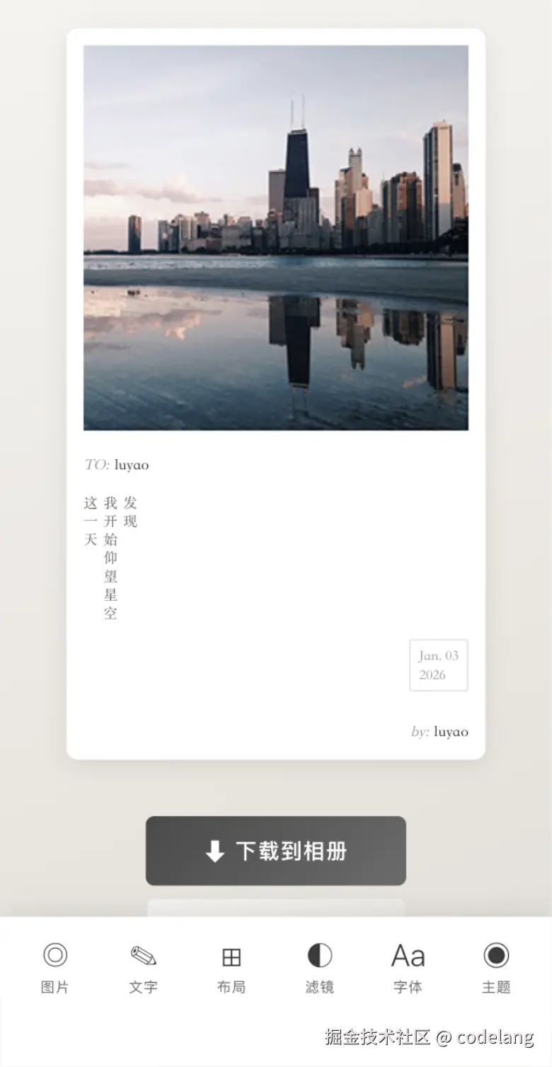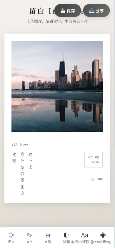 在技术选型中,我最先思考的是如何快速实现自己想要的效果,相比较知识库与社区的成熟度,对于 AI 来说,生成前端的正确率会比移动端会高点,并且能快速的调试。我将留白 preview 图片丢给了 cc,让 cc 按照该图生成前端应用,并为该图增加了滤镜、字体、主题等一类设置,如下是实现效果,你也可以访问 liubai-white.vercel.app/ 进行试玩: