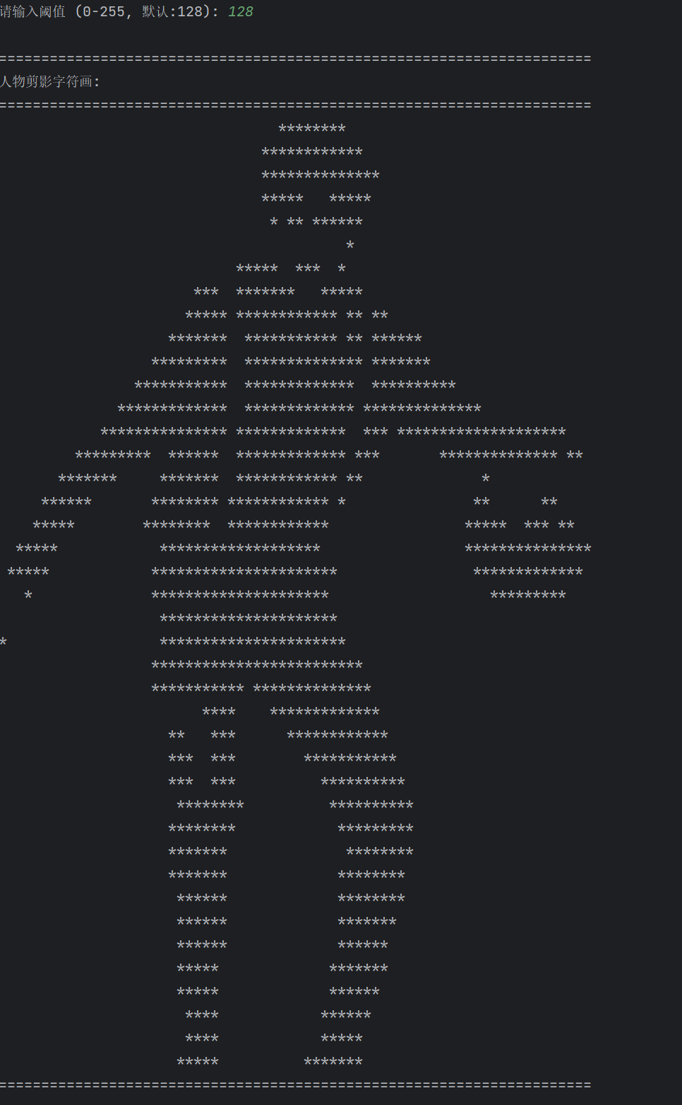 # 生成字符画(像素值 > 阈值 = 字符,否则 = 空格)