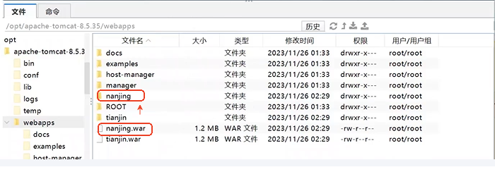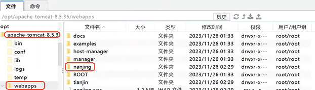 当 tomcat 服务运行中会对其 webapps 目录中的 war 包进行自动解压缩,通过刷新后可以看到项目的 war 包已被解压出项目的文件夹(这里的例子是 nanjing)