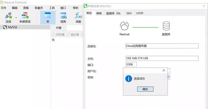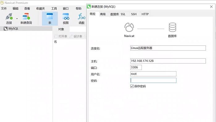 可以随便找一台 Windows 主机上的 navicat 来尝试访问 Linux 服务器上的 MySQL 服务。