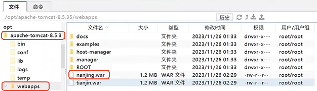 可以把项目 war (比如 nanjing.war)包放到 Linux 服务器中的 tomcat 的 webapps 目录中,当 tomcat 是活动的(即 tomcat 服务运行中)会对项目 war 包自动解压缩,然后就可以看到项目名的文件夹,然后就可以通过 Linux 服务器ip+项目名称访问项目的web页了