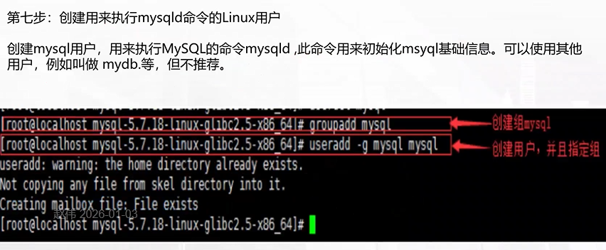 在 MySQL 文件夹中创建用来执行 MySQL 命令的 Linux 用户。mysqld 命令用来初始化 MySQL 的基础信息