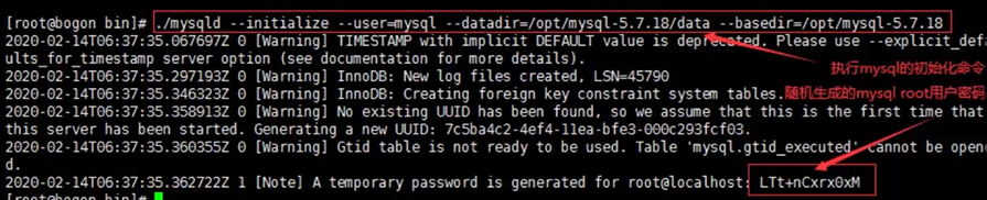 注意,mysqld 命令(带初始化参数 --initialize)执行后,会生成一个临时的 MySQL 数据库 root 账号和 root 账号的密码,需要先把 root 账号的密码拷贝出来记住,后续在第一次登录 MySQL 时需要使用到这个临时密码。