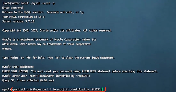 注意,授权命令 grant 是进入 MySQL 数据库后,在 MySQL 数据库里的命令,是 MySQL 数据库自己的命令,而不是 Linux 的命令。