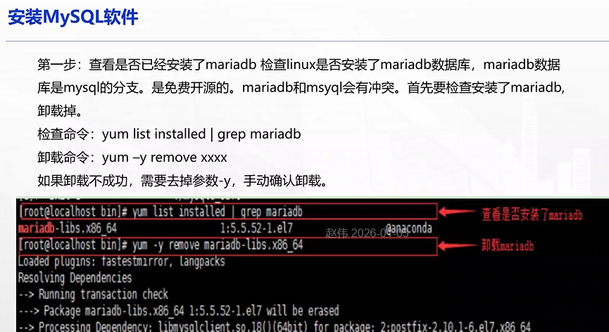 MySQL 和 mariadb 这两个数据库冲突,所以需要先检查系统有否安装了 Mariadb,如果有需要先卸载 Mariadb 后再去安装 MySQL 数据库。