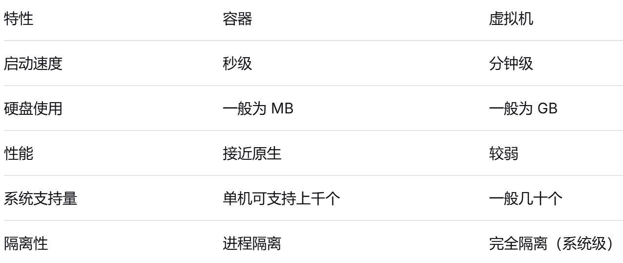 资源占用:Docker 占用资源更少,性能更高,单机可运行更多实例。