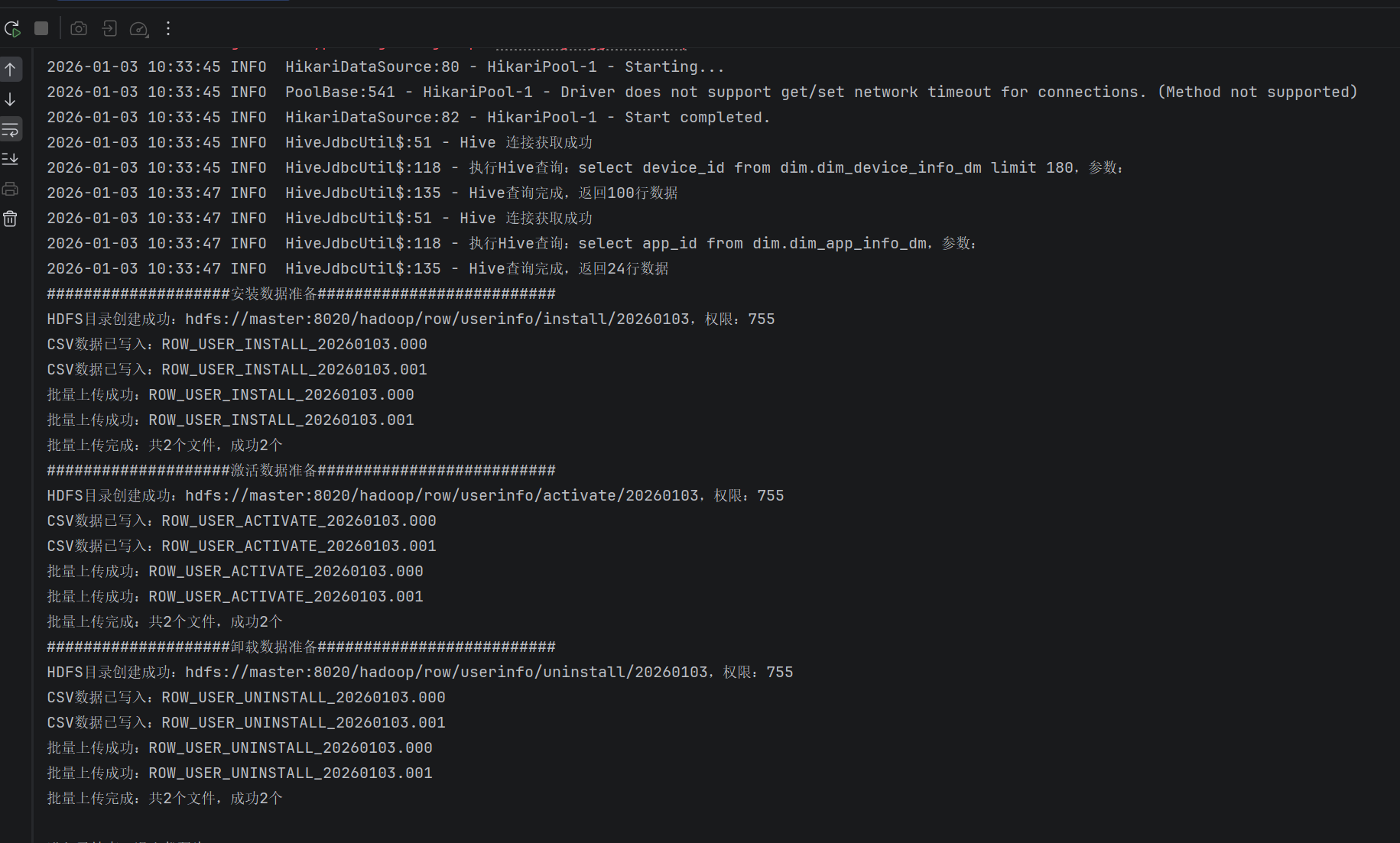 dataToFile 根据输入的设备id和应用id,分别生成三种用户数据,并生成文件上传到hdfs的row层下的对应目录