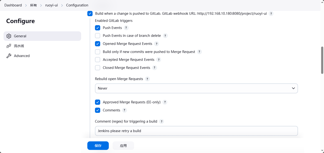 确定之后会进入项目的配置,我们找到流水线,输入测试脚本,保存