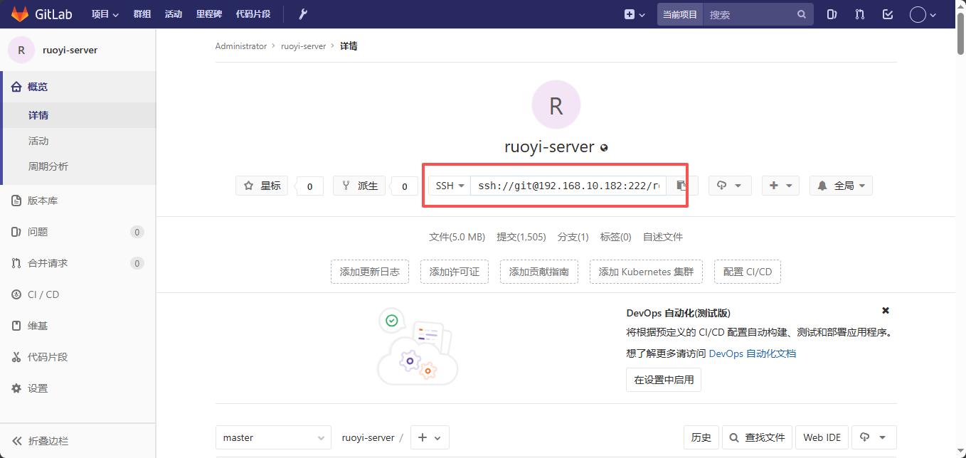 [root@ ruoyi-ui]# git remote add origin ssh://git@192.168.10.80:222/root/ruoyi-ui.git