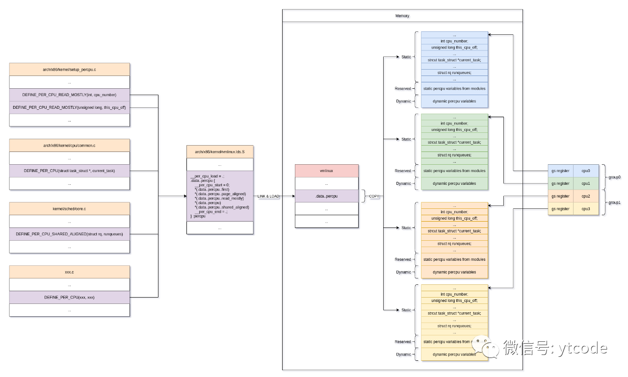 上图中重点描述的是那些,在内核编译期就已经确定的percpu变量,这些变量是静态的,是不会随着时间的推移而动态的增加或减少的,所以它们在内核初始化时,就直接被拷贝到了各个percpu内存块的static区。