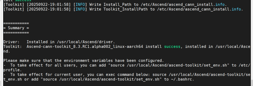 Toolkit: Ascend-cann-toolkit_8.0.0_linux-aarch64 install success, installed in /usr/local/Ascend.