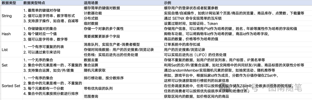 Redis常用的数据类型:String、Hash、List、Set、Sorted Set,下面对这几种数据类型的特点和适用场景简单做了一下对比,在实际的业务场景中,可以根据各种数据类型的特点选择使用不同的数据类型,从而达到比较好的使用效果。