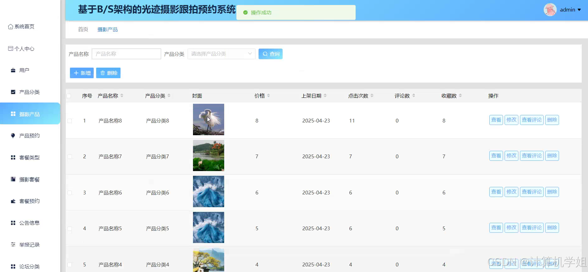 基于SpringBoot+VUE+MYSQL的光迹摄影跟拍预约系统,是针对摄影行业跟拍服务预约流程繁琐、信息管理低效等问题设计的数字化解决方案。系统采用前后端分离架构,前端以VUE框架构建用户交互界面,实现预约表单填写、摄影师信息展示、订单状态跟踪等功能;后端依托SpringBoot框架搭建服务端逻辑,处理用户请求、管理预约数据及业务规则;数据库采用MYSQL存储用户信息、摄影师资料、预约订单等核心数据。系统支持用户在线预约、摄影师接单、订单管理、评价反馈等全流程操作,同时提供管理员后台进行数据统计与系统维护。通过整合三大技术栈,系统实现了预约流程的自动化与透明化,有效提升了摄影跟拍服务的效率与用户体验。相较于传统预约方式,该系统降低了沟通成本,减少了人工操作错误,为摄影行业数字化转型提供了技术支撑,具有较高的实用价值与市场推广潜力。