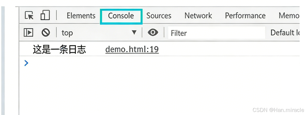 注意:在 VSCode 中直接输入log再按 tab 键,就可以快速输入console.log需要打开浏览器的开发者工具 (F12) => Console 标签页 才能看到结果.