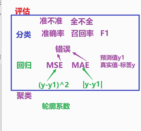 回归指标:MSE((真实值-预测值)^2)、MAE(|真实值-预测值|)
