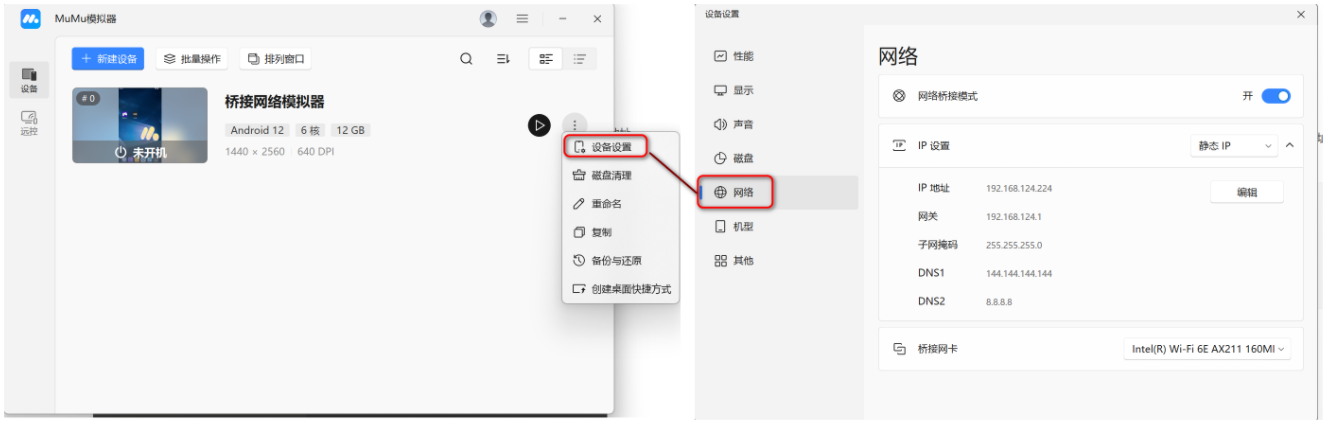 ipfonfig,找到无线局域网适配器 WLAN:bash无线局域网适配器 WLAN: 连接特定的 DNS 后缀 . . . . . . . : 本地链接 IPv6 地址. . . . . . . . : ****::****:****:****:**** IPv4 地址 . . . . . . . . . . . . : 192.168.124.80 子网掩码 . . . . . . . . . . . . : 255.255.255.0 默认网关. . . . . . . . . . . . . : 192.168.124.1配置MuMu模拟器配置,开启网络桥接模式(我这里已经下载好了驱动),将上面的配置一一对应。这里也不一定要和我一样,DHCP也可以,不过重启关机后ip可能会改变(但是局域网换了,ip也会改变,比如说换了WIFI),然后重新设置应用的url即可。