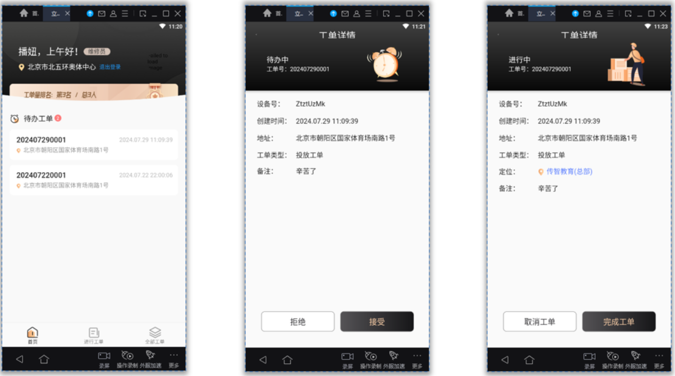 管理员在后台创建工单后,工作人员可在运营管理App中查看并根据情况选择接受或取消分配给自己的任务