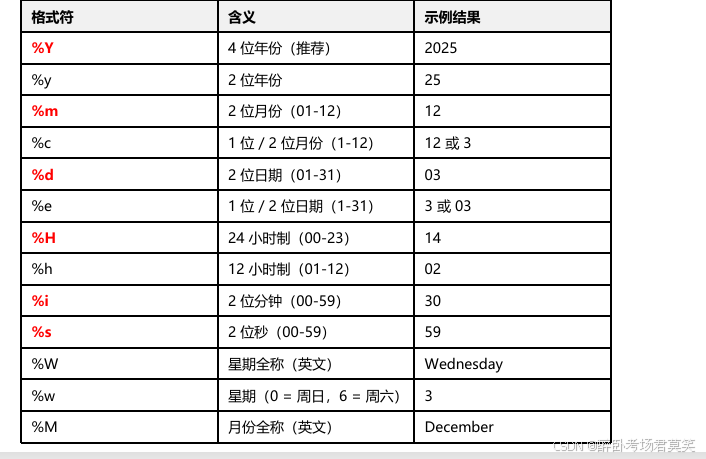 STR_TO_DATE() 转换SELECT STR_TO_DATE('12/03/2025', '%m/%d/%Y')
