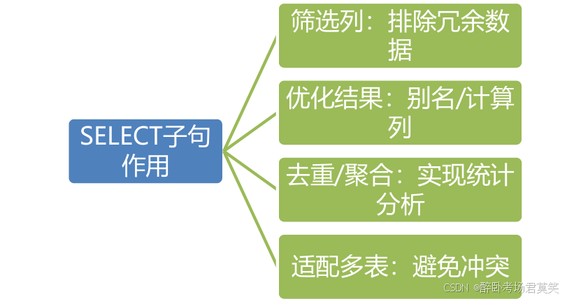 - SELECT语句是完成一次数据查询的完整SQL指令,而SELECT子句是负责定义"返回什么数据"的核心部分。