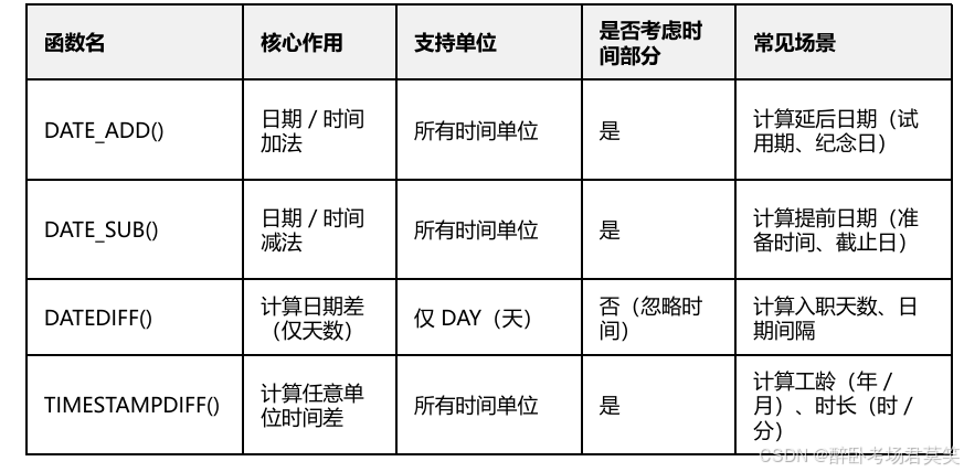• 常用日期函数:系统时间、时间计算、类型转换、提取单位