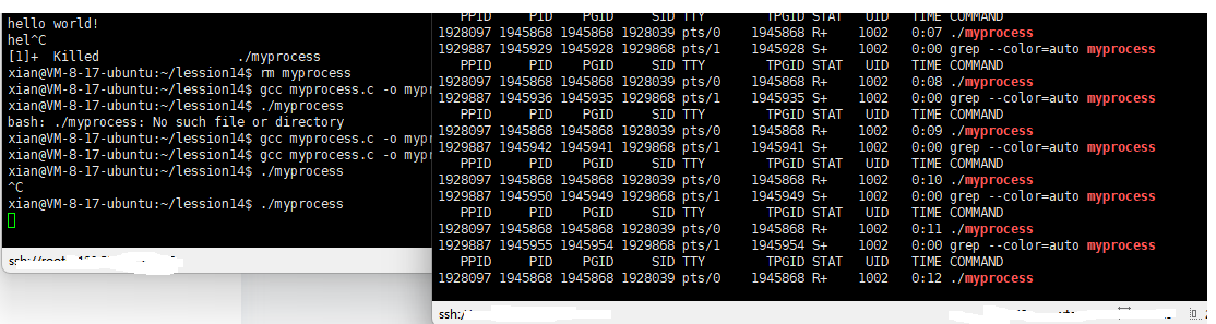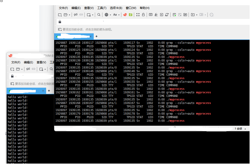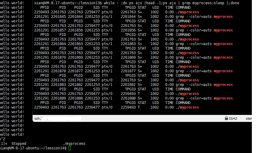 在终端中运行myprocess进程时,它会持续输出"hello world!"。当我们在另一个终端持续监控该进程状态时,如果在第一个终端按下Ctrl+Z,进程状态将变为T(__TASK_STOPPED),即暂停状态。