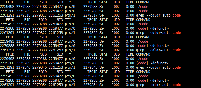 当count减为0时,子进程退出,父进程未回收,为Z僵尸状态。