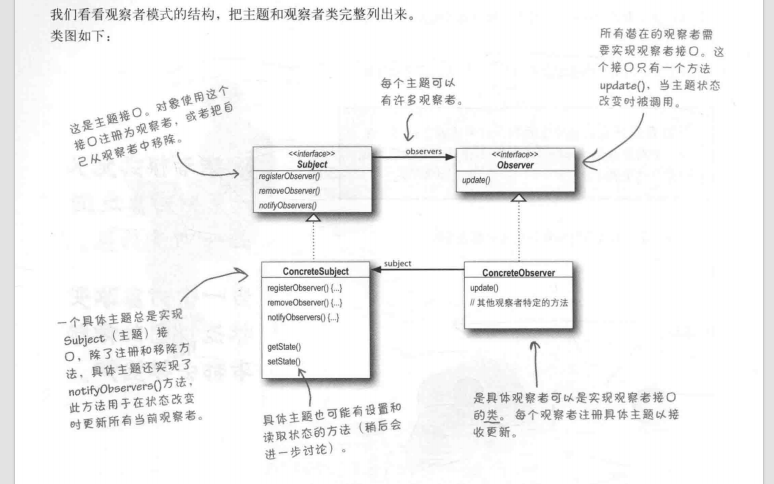 稍后你会发现,观察者模式有几种不同的实现方式,但大多数都围绕着包括主题和观察者接口的类设计。