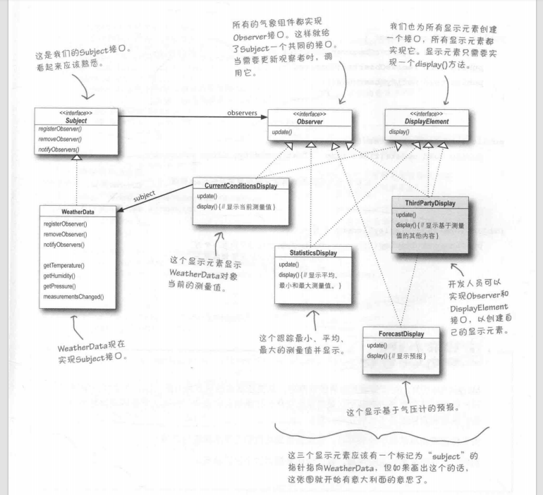 在书中,我们需要建造基于Internet的气象观测站。这个气象站又基于WeatherData对象,这个对象追踪当前的天气状况(温度,湿度和气压)。我们要创建一个应用,该应用一开始提供三个显示元素(页面显示的内容和方式):当前状况,气象统计以及简单的预报。当WeatherData对象获得最新的测量数据时,三个显示元素都必须实时更新。