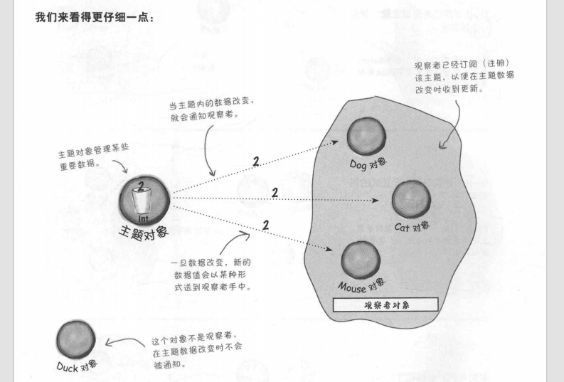这里的依赖是怎样体现的呢?因为主题是数据的唯一拥有者,观察者是主题的依赖者,在数据变化时更新,这样比起允许许多对象控制同一份数据来,可以得到更干净的OO设计。