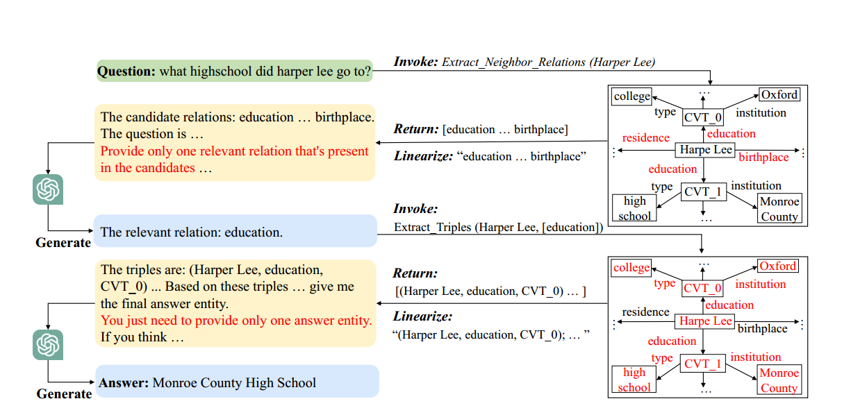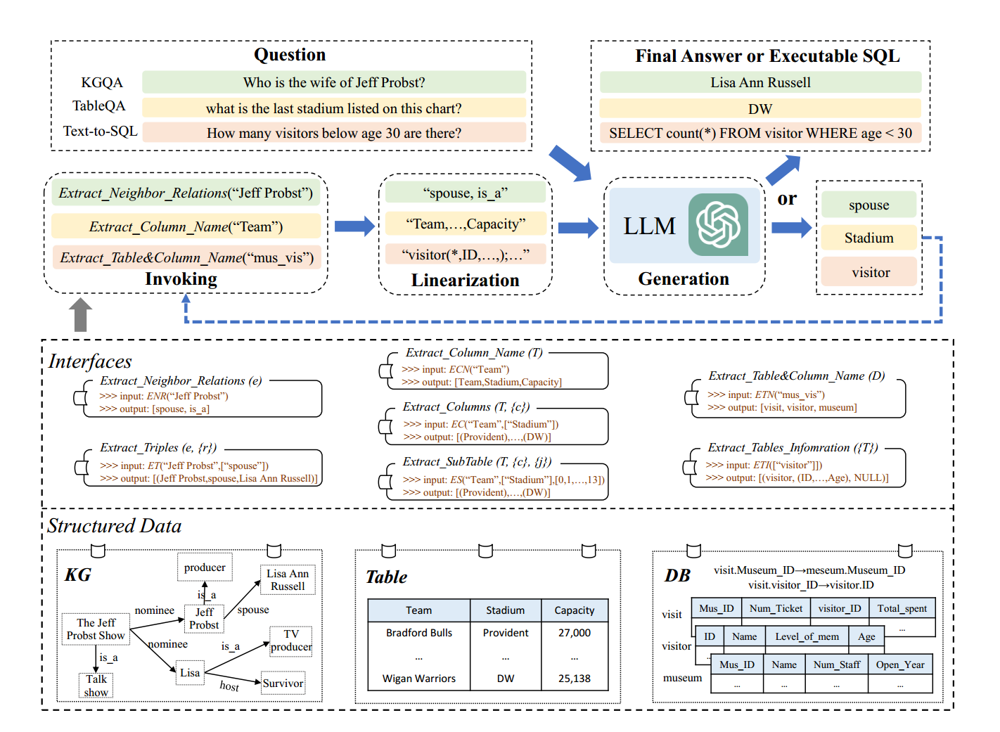 给定 问题q 和 结构化数据S(例如,知识图、表或数据库),LLM需要从S中提取有用数据 ,然后基于有用数据来回答问题q。
