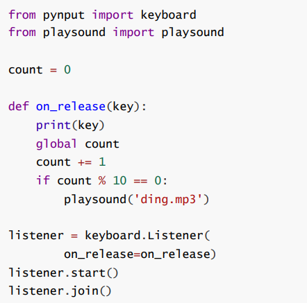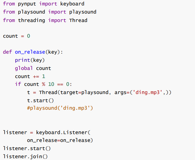 - 使用 listener.join 让程序等待用 户按键. 使用 count 计数, 每隔 10 次, 调用 playsound 播放音频文件.