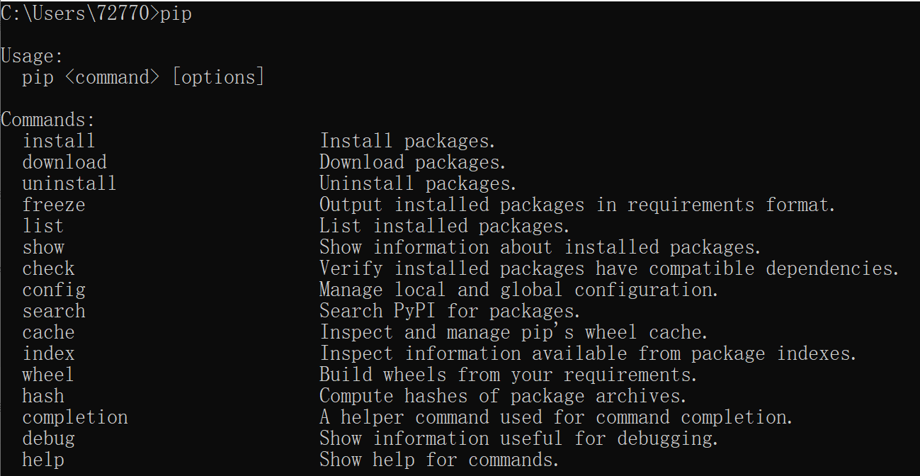 打开 cmd, 直接输入 pip. 如果显示以下帮助信息, 说明 pip 已经准备就绪.