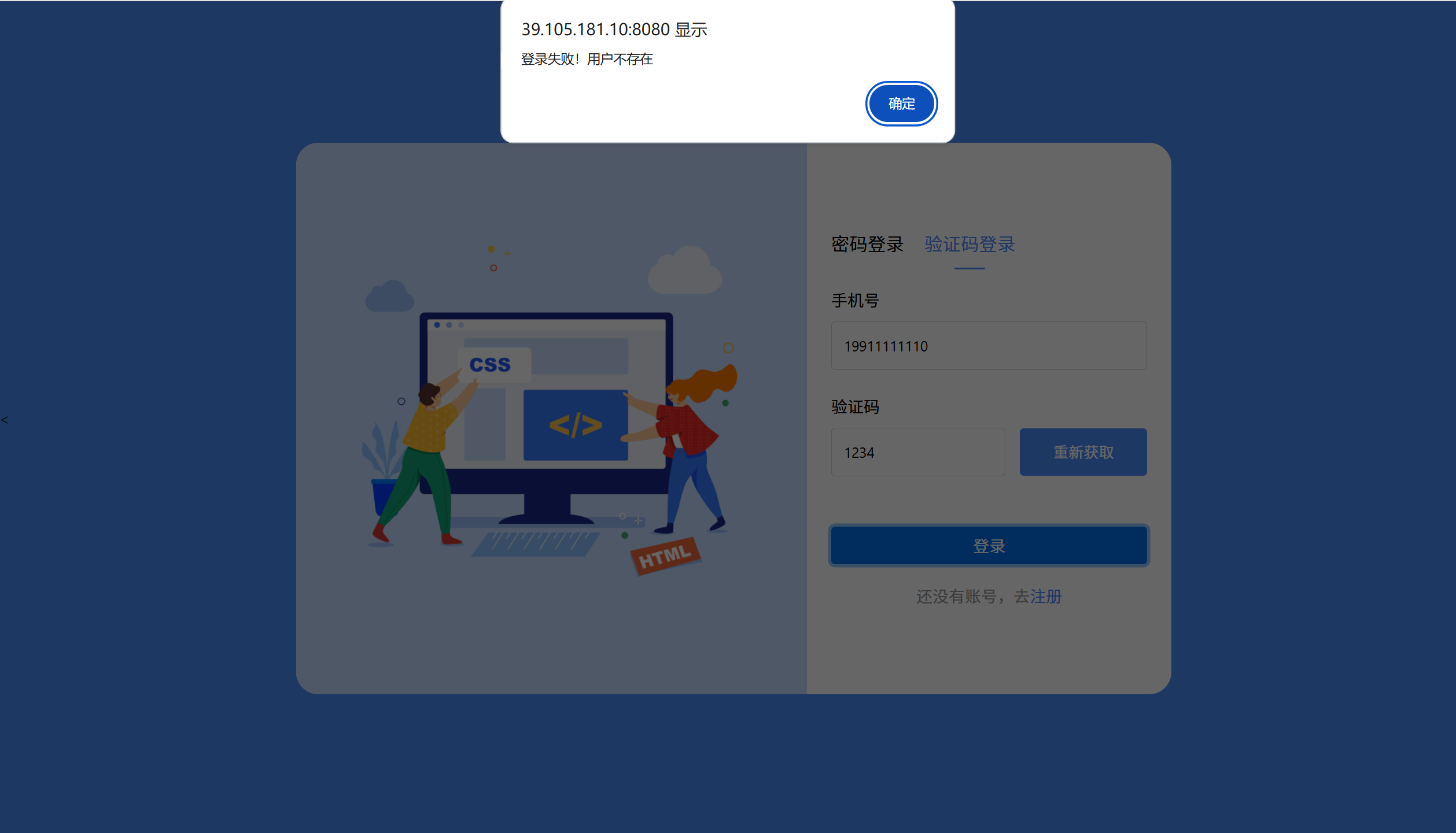 预期结果:弹窗提示用户验证码错误