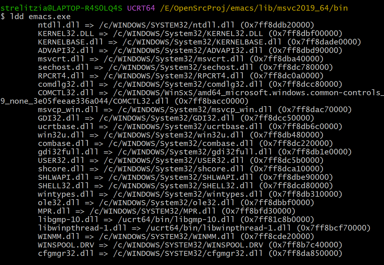 在 UCRT64 终端中,进入 emacs.exe 所在目录,执行 ldd ./emacs.exe。这会列出 emacs.exe 直接和间接依赖的所有 DLL 及其当前查找路径。输出中所有指向 ucrt64/bin/ 的 DLL,都可能需要被复制。执行结果如下所示,通过输出结果能够看到,缺少 libgmp-10.dll 与 libwinpthread-1.dll 库。