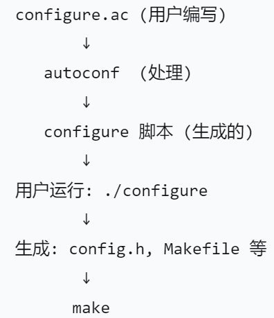 2. 生成配置脚本:根据 configure.ac(或 configure.in)模板,生成可移植的 shell 配置脚本(configure)。