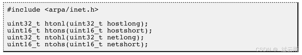 为使网络程序具有可移植性,使同样的C代码在大端和小端计算机上编译后都能正常运行,可以调用以下库函数做网络字节序和主机字节序的转换。