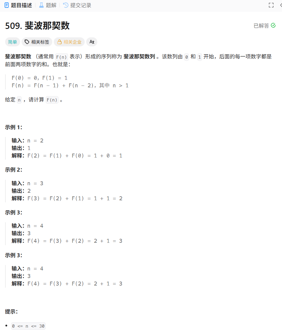 题目链接:509. 斐波那契数 - 力扣(LeetCode)