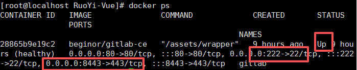 ee0bf611d38c beginor/gitlab-ce "/assets/wrapper" 12 minutes ago Up 1 second (health: starting) 0.0.0.0:80->80/tcp, :::80->80/tcp, 0.0.0.0:222->22/tcp, :::222->22/tcp, 0.0.0.0:8443->443/tcp, :::8443->443/tcp gitlab