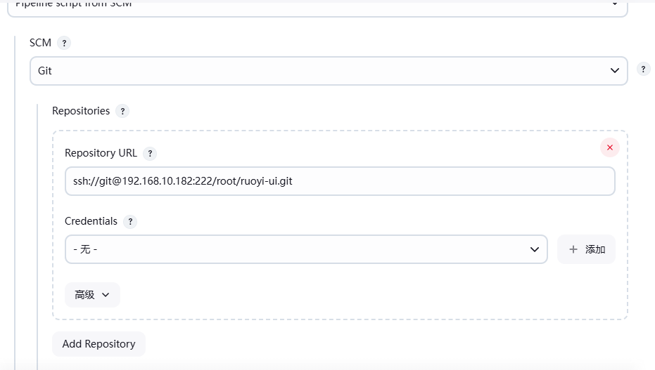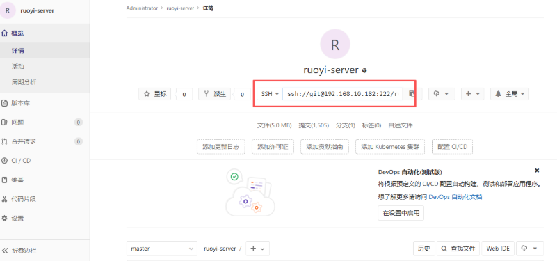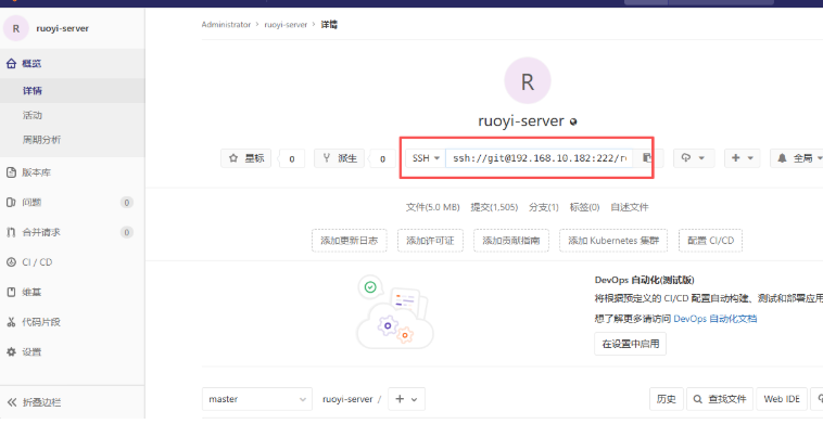 [root@benet23 ruoyi-ui]# git remote add origin ssh://git@192.168.10.80:222/root/ruoyi-ui.git
