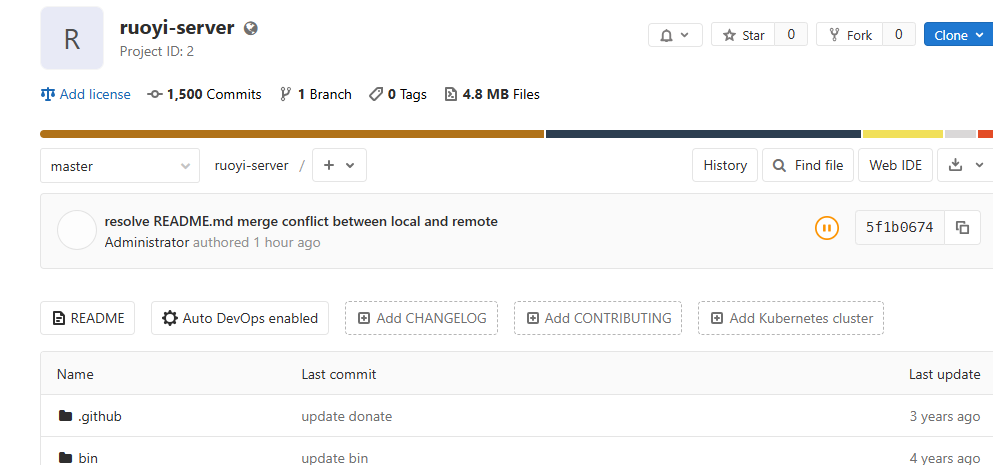 root@benet23 ruoyi-ui\]# git push -u origin master Username for 'http://192.168.10.80': root Password for 'http://root@192.168.10.80': Counting objects: 391, done. Delta compression using up to 2 threads. Compressing objects: 100% (340/340), done. Writing objects: 100% (391/391), 1.26 MiB \| 0 bytes/s, done. Total 391 (delta 19), reused 0 (delta 0) remote: Resolving deltas: 100% (19/19), done. To http://192.168.10.80/root/ruoyi-ui.git * \[new branch\] master -\> master 分支 master 设置为跟踪来自 origin 的远程分支 master。