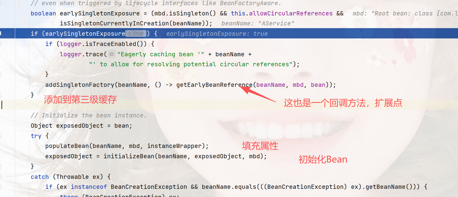 但是,这里同样和第一次一样,并没有缓存,然后直到走到依赖注入populateBean,然后inject,要注入AService,最后走到下面这个代码,此时按顺序从一二三级缓存查找,最后找到了AService在实例化之后加入的实例对象,最后加入到第二缓存。