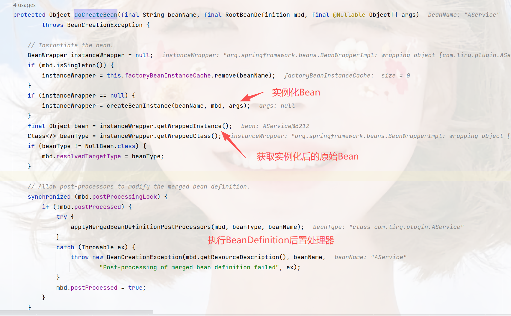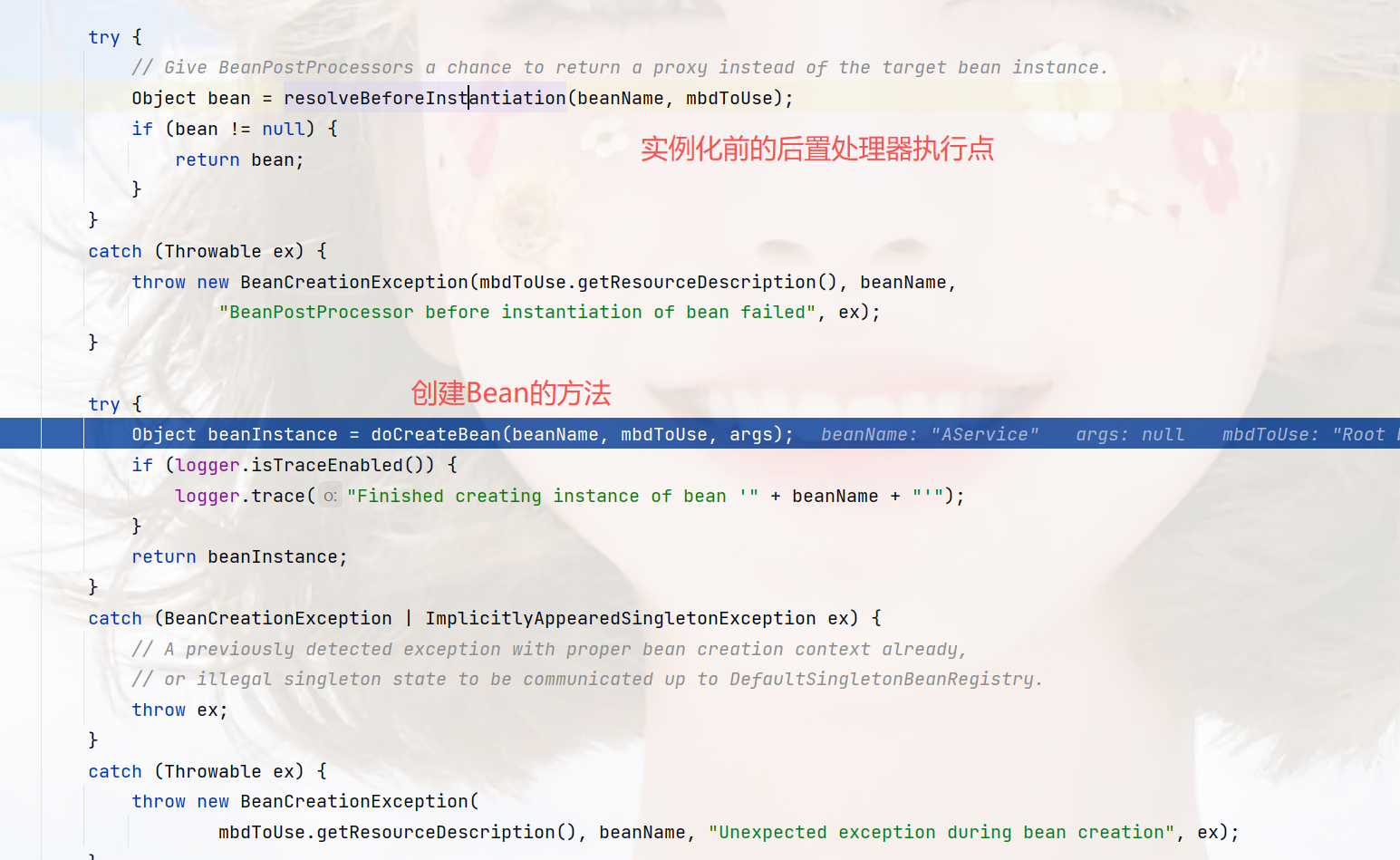 重点看createBean,位置:org.springframework.beans.factory.support.AbstractAutowireCapableBeanFactory#createBean(java.lang.String, org.springframework.beans.factory.support.RootBeanDefinition, java.lang.Object[])
