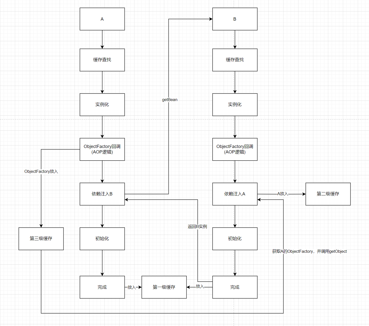 这个原理,其实不难,可以理解为对象引用的操作。即当AService实例化后, 将当前实例对象放入缓存(这里我们不管几级缓存),这时还没有初始化,然后初始化时,依赖注入getBean("BService"),这时BService要注入AService,它就从缓存中取,缓存中有这个实例化好的AService,然后它注入到BService中,同样也放入缓存,返回实例对象,然后回到AService注入的过程,它已经可以拿到BService实例对象了,然后再设置到属性中。