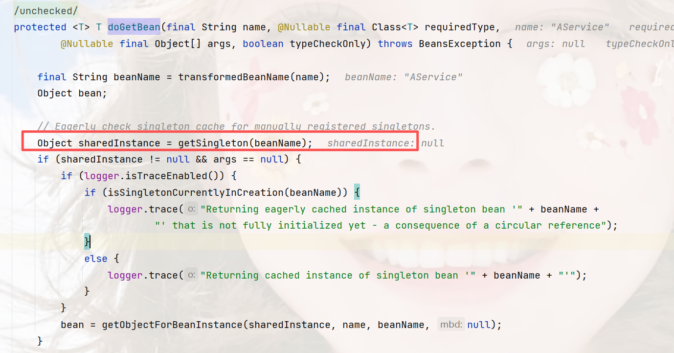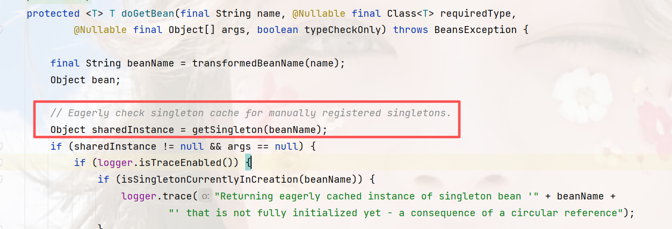这一段,是从缓存中获取单例Bean的逻辑,可以看到: